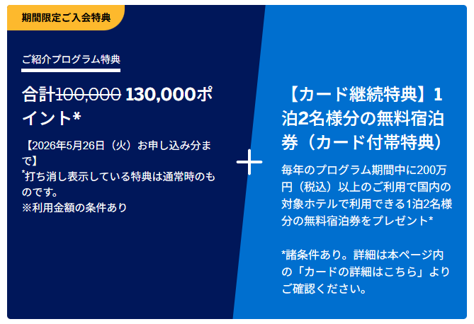 対象ホテルに1泊2名で無料宿泊できる特典が付与されます。