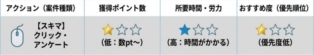 | ポイントインカム | ○ 普通 | ○ コツコツ向き | ◎ しやすい | ボーナスやキャンペーンが豊富。楽しみながら貯めたい人向け |