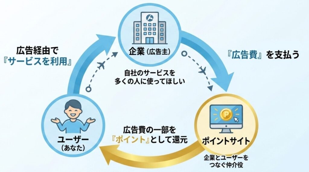 この仕組みがあるからこそ、ユーザーは無料でポイントを受け取ることができます。